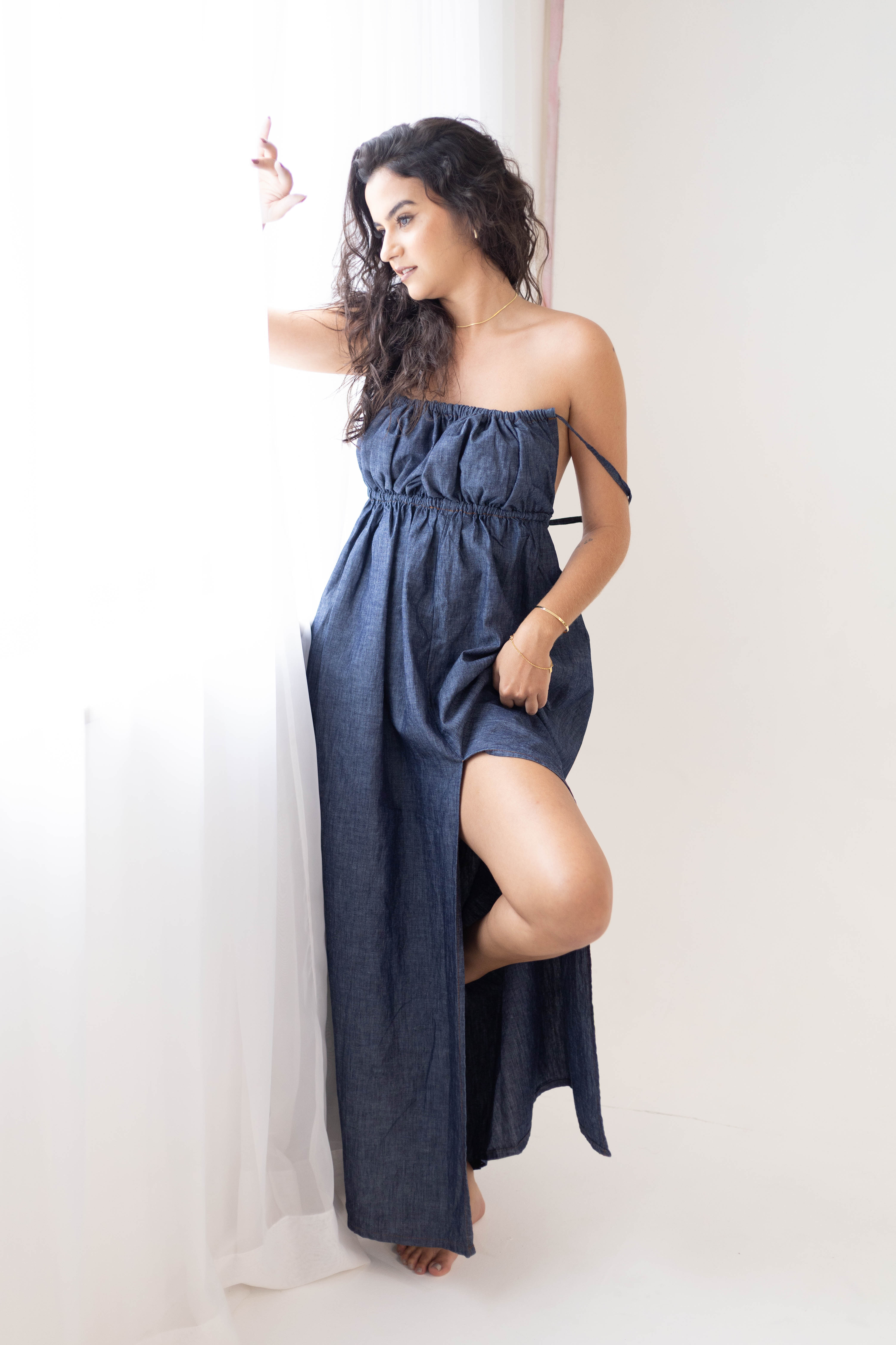 O vestido Lais é puro movimento. Com modelagem ampla e amarrações múltiplas, ele se ajusta a vários corpos e estilos. As costas são bem abertas, com uma fenda frontal charmosa. Você escolhe como quer amarrar: frente única, cruzado nas costas, alcinhas… É um vestido que se transforma com você. Disponível no jeans e no cru, claro 🤍